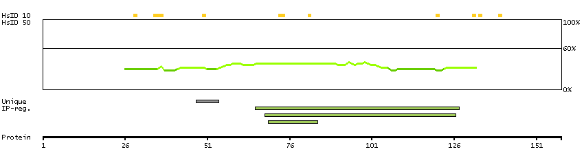 Below the antigens, the maximum percent sequence identity of the protein to all other proteins from other human genes is displayed, using a sliding window of 10 aa residues (HsID 10) or 50 aa residues (HsID 50). The region with the lowest possible identity is always selected for antigen design, with a maximum identity of 60% allowed for designing a single-target antigen (read more).