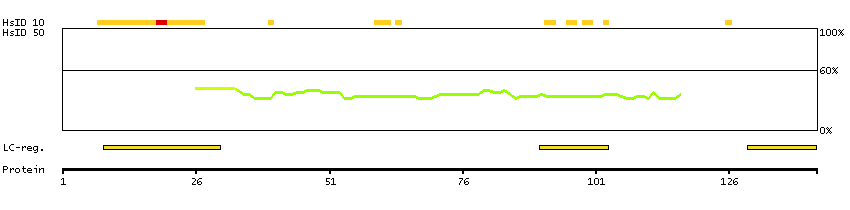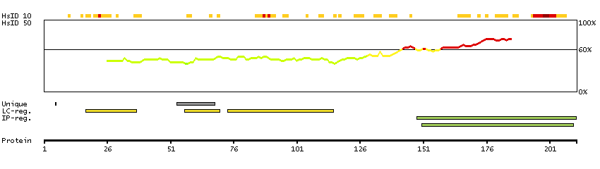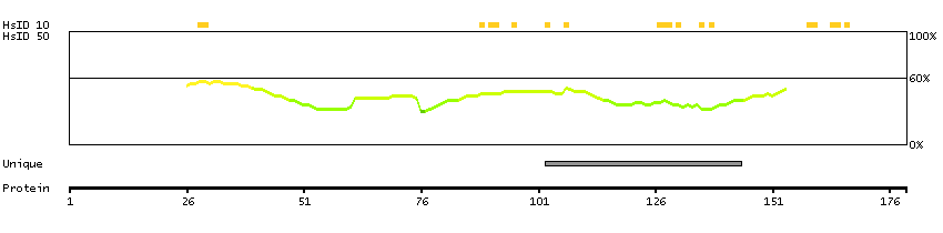 Below the antigens, the maximum percent sequence identity of the protein to all other proteins from other human genes is displayed, using a sliding window of 10 aa residues (HsID 10) or 50 aa residues (HsID 50). The region with the lowest possible identity is always selected for antigen design, with a maximum identity of 60% allowed for designing a single-target antigen (read more).