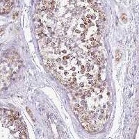 Immunohistochemical staining of human testis shows strong cytoplasmic positivity in cells in seminiferus ducts.
