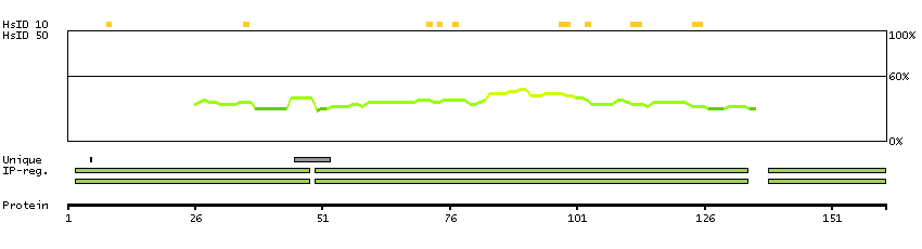 Below the antigens, the maximum percent sequence identity of the protein to all other proteins from other human genes is displayed, using a sliding window of 10 aa residues (HsID 10) or 50 aa residues (HsID 50). The region with the lowest possible identity is always selected for antigen design, with a maximum identity of 60% allowed for designing a single-target antigen (read more).