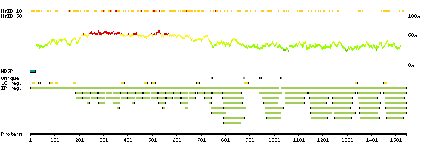 Below the antigens, the maximum percent sequence identity of the protein to all other proteins from other human genes is displayed, using a sliding window of 10 aa residues (HsID 10) or 50 aa residues (HsID 50). The region with the lowest possible identity is always selected for antigen design, with a maximum identity of 60% allowed for designing a single-target antigen (read more).
