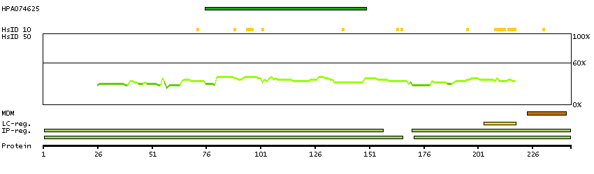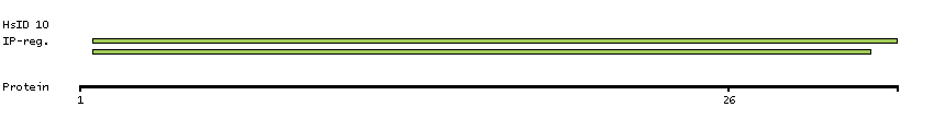 Below the antigens, the maximum percent sequence identity of the protein to all other proteins from other human genes is displayed, using a sliding window of 10 aa residues (HsID 10) or 50 aa residues (HsID 50). The region with the lowest possible identity is always selected for antigen design, with a maximum identity of 60% allowed for designing a single-target antigen (read more).