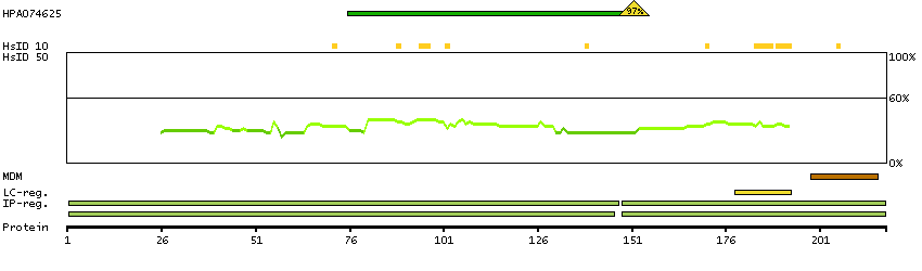 At the top of the view, the position of the antigen (identified by the corresponding HPA identifier) is shown as a green bar. A yellow triangle on the bar indicates a <100% sequence identity to the protein target.