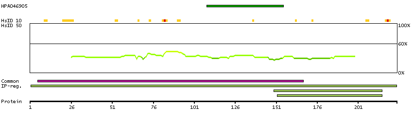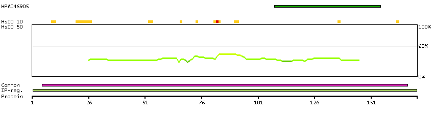 At the top of the view, the position of the antigen (identified by the corresponding HPA identifier) is shown as a green bar. A yellow triangle on the bar indicates a <100% sequence identity to the protein target.