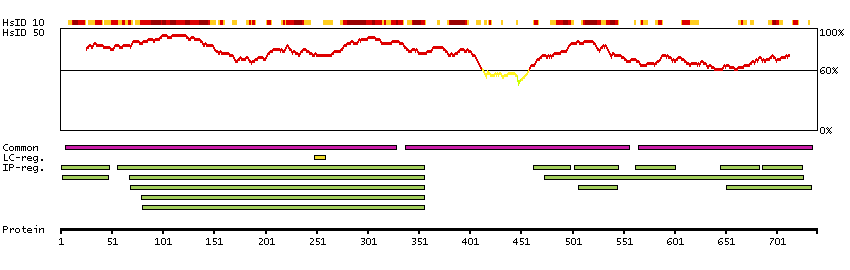 Below the antigens, the maximum percent sequence identity of the protein to all other proteins from other human genes is displayed, using a sliding window of 10 aa residues (HsID 10) or 50 aa residues (HsID 50). The region with the lowest possible identity is always selected for antigen design, with a maximum identity of 60% allowed for designing a single-target antigen (read more).