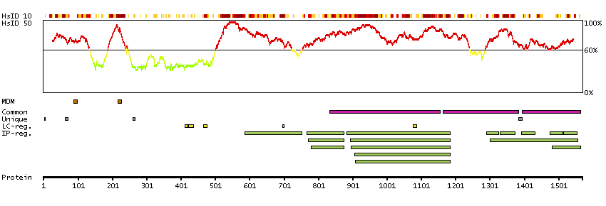 Low complexity regions are shown in yellow and InterPro regions in green. Common (purple) and unique (grey) regions between different splice variants of the gene are also displayed (read more), and at the bottom of the protein view is the protein scale.