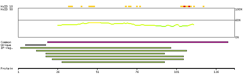 Below the antigens, the maximum percent sequence identity of the protein to all other proteins from other human genes is displayed, using a sliding window of 10 aa residues (HsID 10) or 50 aa residues (HsID 50). The region with the lowest possible identity is always selected for antigen design, with a maximum identity of 60% allowed for designing a single-target antigen (read more).