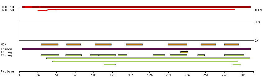 Below the antigens, the maximum percent sequence identity of the protein to all other proteins from other human genes is displayed, using a sliding window of 10 aa residues (HsID 10) or 50 aa residues (HsID 50). The region with the lowest possible identity is always selected for antigen design, with a maximum identity of 60% allowed for designing a single-target antigen (read more).