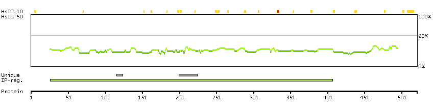 Below the antigens, the maximum percent sequence identity of the protein to all other proteins from other human genes is displayed, using a sliding window of 10 aa residues (HsID 10) or 50 aa residues (HsID 50). The region with the lowest possible identity is always selected for antigen design, with a maximum identity of 60% allowed for designing a single-target antigen (read more).
