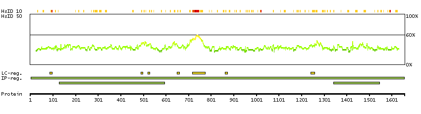 Low complexity regions are shown in yellow and InterPro regions in green. Common (purple) and unique (grey) regions between different splice variants of the gene are also displayed (read more), and at the bottom of the protein view is the protein scale.