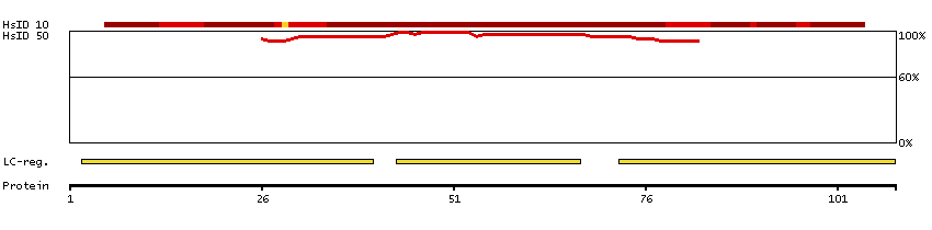Below the antigens, the maximum percent sequence identity of the protein to all other proteins from other human genes is displayed, using a sliding window of 10 aa residues (HsID 10) or 50 aa residues (HsID 50). The region with the lowest possible identity is always selected for antigen design, with a maximum identity of 60% allowed for designing a single-target antigen (read more).